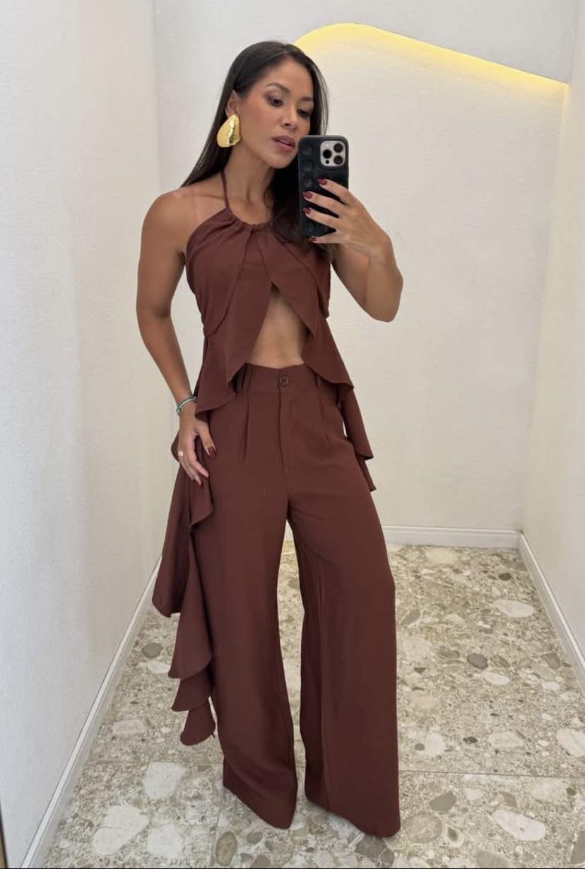 Conjunto feminino em tecido leve, composto por calça pantalona e blusa com decote halter e babados laterais. Moderno e elegante, perfeito para looks sofisticados e cheios de estilo.